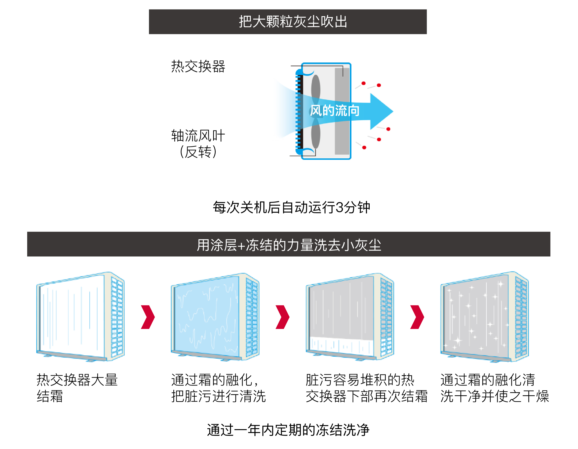 設(shè)備在每次關(guān)機后室外機風(fēng)葉會反轉(zhuǎn)3分鐘進行清潔作業(yè)。