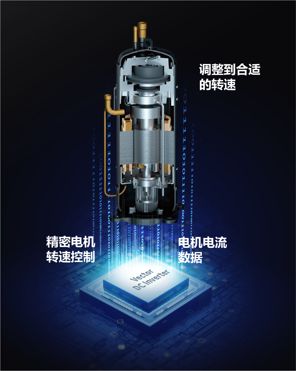我們的矢量直流變頻系統(tǒng)配備了一顆微芯片來控制壓縮機的轉(zhuǎn)速。優(yōu)化了形狀和電極設(shè)計的轉(zhuǎn)子可以有效抑制電磁噪聲,并優(yōu)化低速運行時的能效。