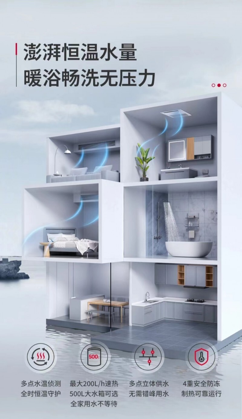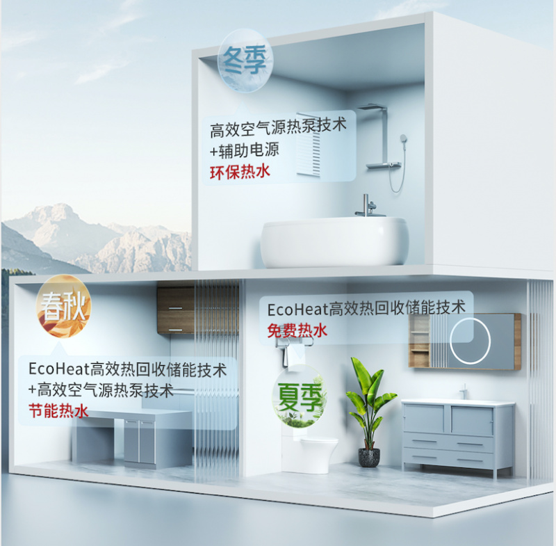 春秋季節,高效熱回收儲能技術和空氣源熱泵技術雙重發力,24小時低耗省電,讓節能熱水觸手可得;夏季在制冷的同時可以源源不斷獲得免費熱水;冬季利用輔助電源,保障熱水供應。500L大容量水箱,搭配多點水溫檢測、 立體供水和4重防凍系統,讓多口家庭自由使用熱水,生活更加便利,為消費者節約了制取生活熱水的成本,給用戶品質生活帶來更加舒適便捷的體驗。